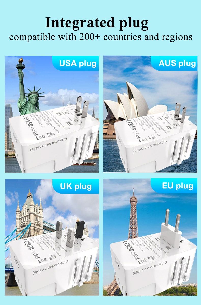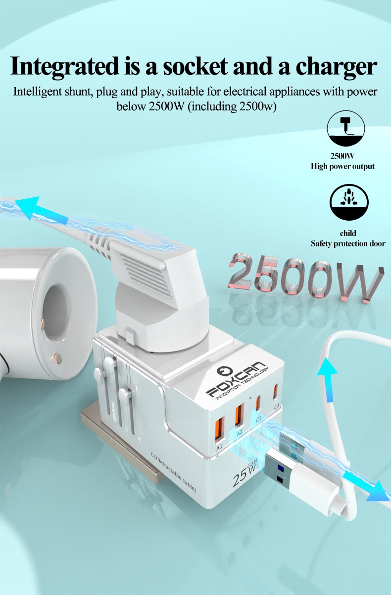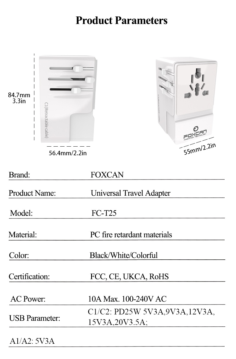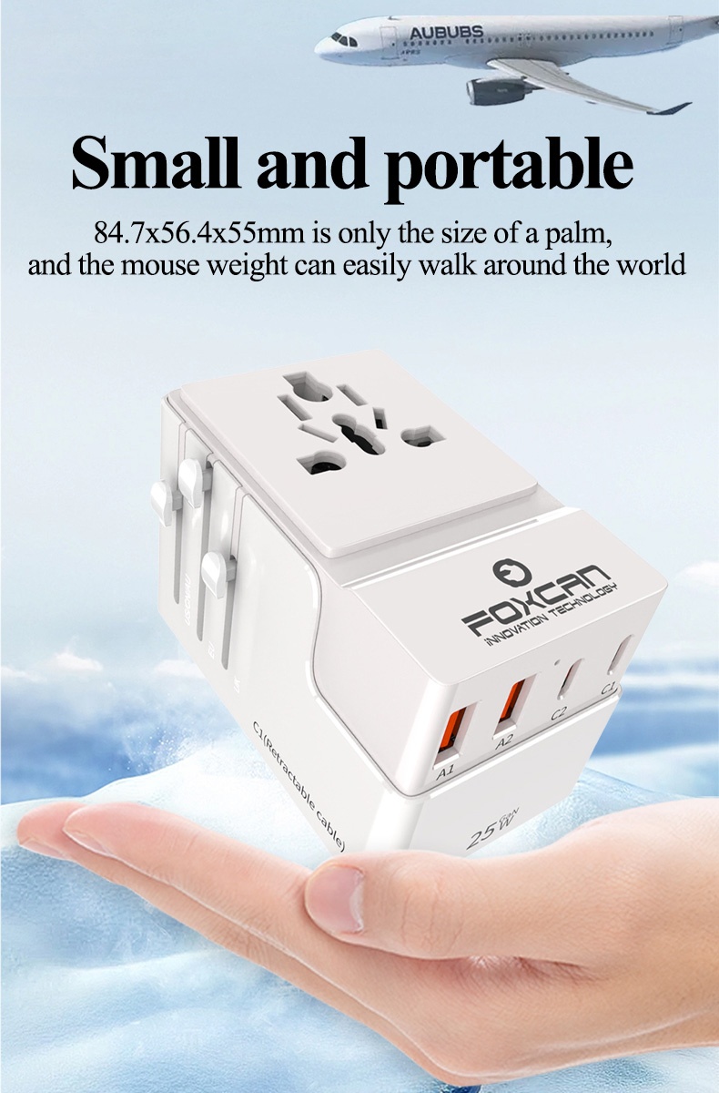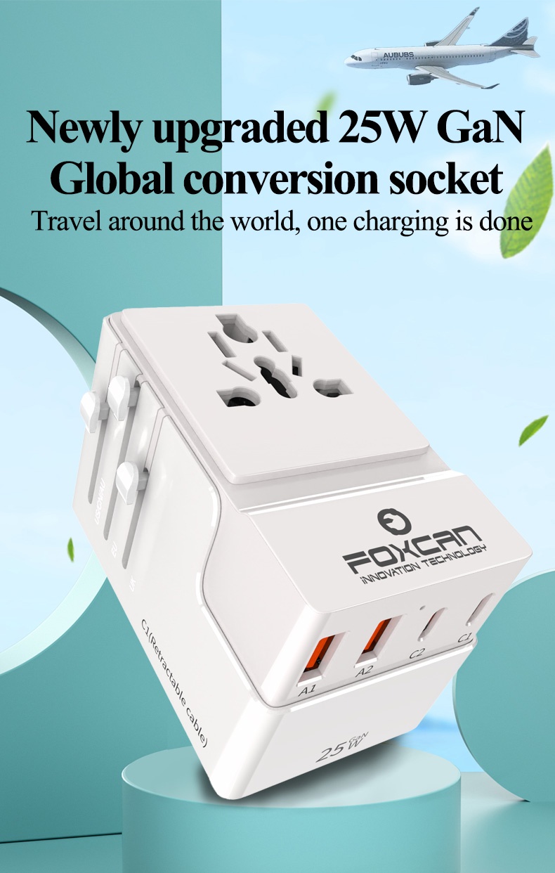 • Name:FOXCAN-T25 GaN PD25W Universal Travel Adapter with 2USB-C+2USB-A Charger US Europe Australia Britain Plug Adapter