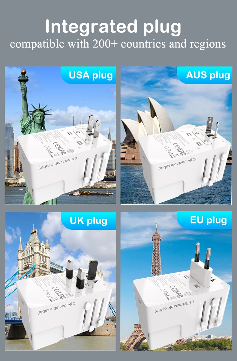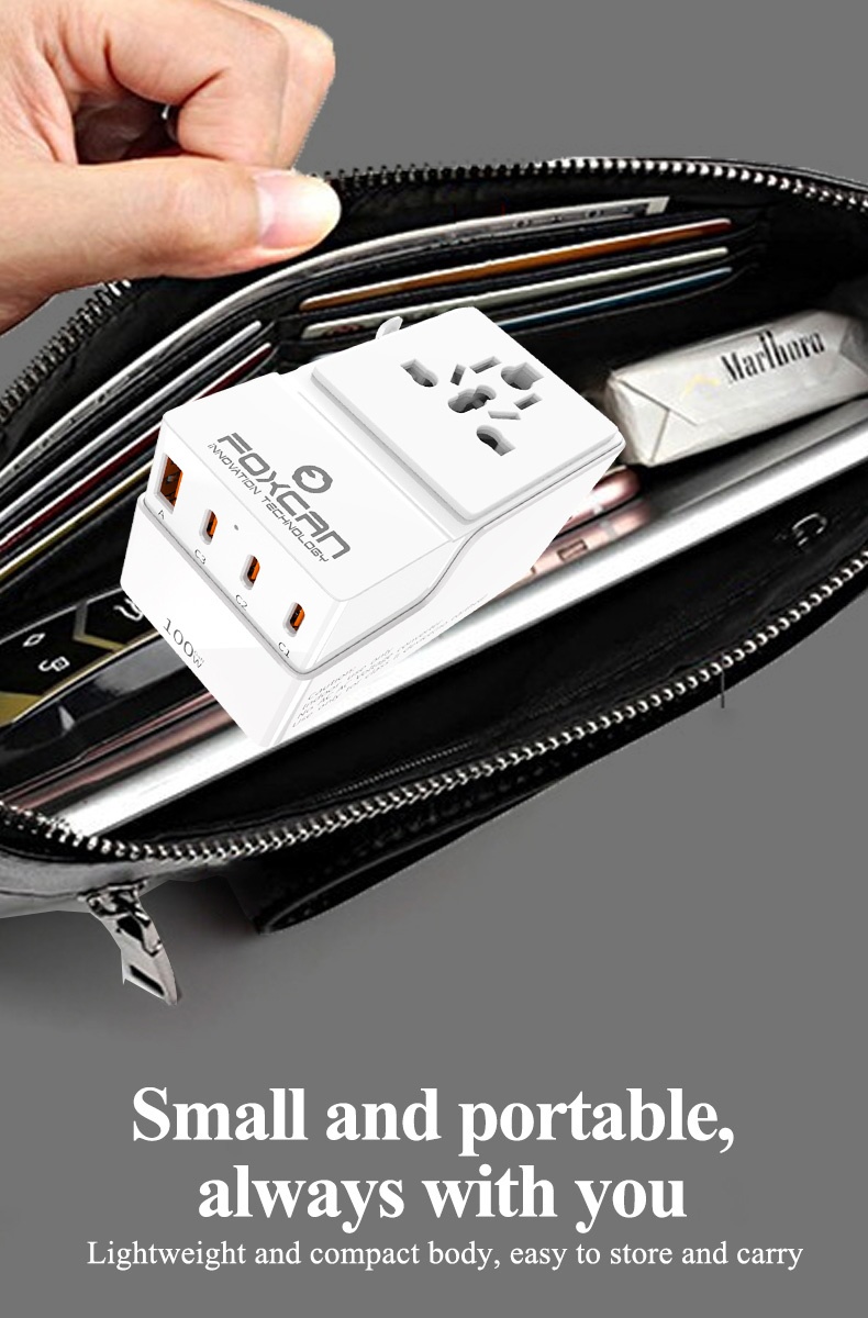 • Name:FOXCAN-T100 GaN PD100W Universal Travel Adapter with 2USB-C+2USB-A Charger US Europe Australia Britain Plug Adapter